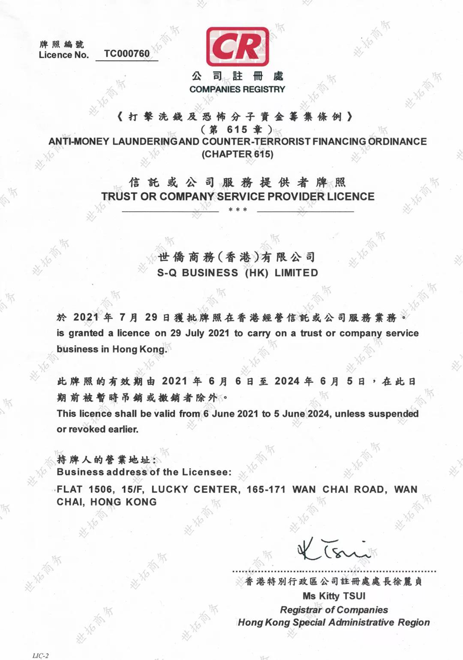 这无疑对所有信托及公司服务提供者,提出了更专业,严格和高资质的要求。秘书公司必须通过一系列的面试,调查和审核才能取得合法牌照。我司达到合格条件,目前已取得香港公司注册处颁发的最新秘书牌照。
